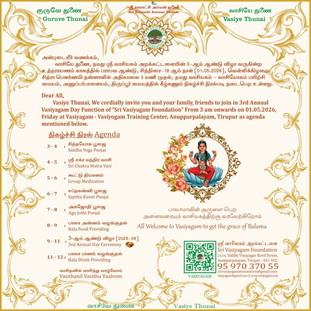 Vasi is the air that supports your body and soul to be in connective right from birth till we are in this world. Yogam is the best sense to awaken your inner spiritual light to enlighten your knowledge. Vasiyogam trains your breath to light your spiritual knowledge, which empowers the world being in right path.